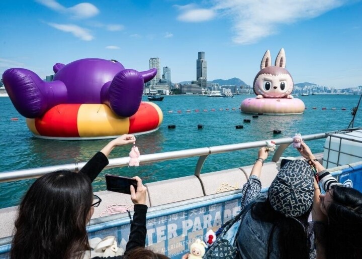 日本の「ドラえもん」や中国のアートトイ「LABUBU(ラブブ)」、マクドナルドの「グリマス」、米国の教育番組「セサミストリート」と現代アーティストKAWSがコラボした「KAWS&セサミストリート(エルモ)」の4体の巨大なインフレータブル作品がビクトリア・ハーバーに登場し、市民や観光客が写真を撮影していた。