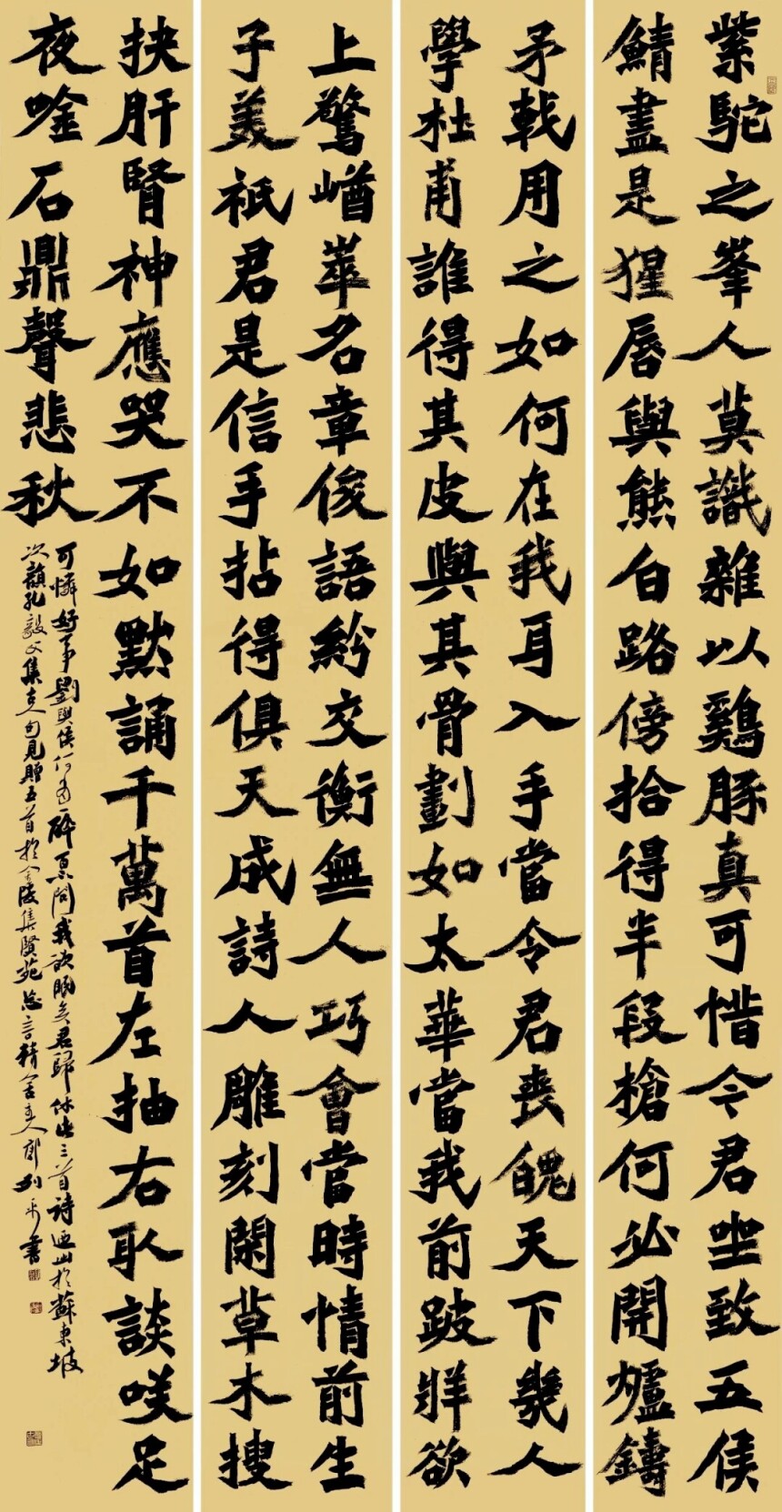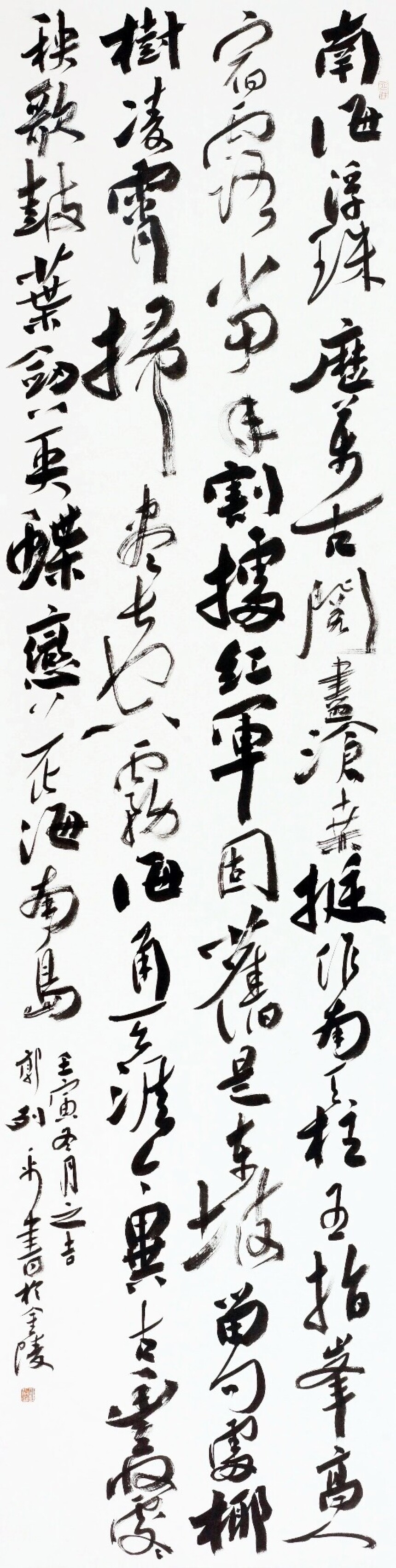 郭列平の書法の個性と作風は「重厚で力強く、優美で伸びやか。両者の調和は見事だ」と評される。彼の作品は、ほぼ一字一字が筆画を単位として構成され、ある時は力強く、ある時は優美に運ばれた筆画が調和を醸し出し、書の美的領域において独自の位置を占めている。(編集/RR)