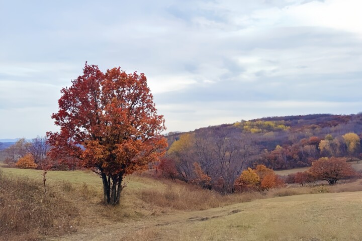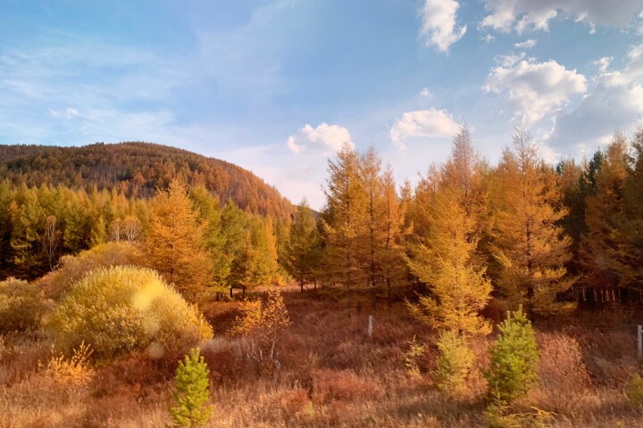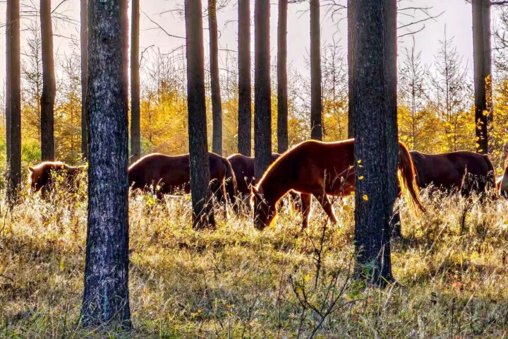 秋が訪れ、河北省囲場満族蒙古(モンゴル)族自治県は、1年で最も詩的な季節を迎えている。山々を覆う木々は様々な色に染まり、シラカバは黄金色の衣をまとい、そよ風が吹くと、葉がまるで金箔のようにひらひらと舞い落ち、あたりに柔らかなじゅうたんを敷き詰めている。木々の間から差し込む秋の日差しは、躍動的な光と影を作り出す。遠くの丘陵を眺めると、クヌギやカエデがまるで燃え盛る炎のように真っ赤に染まり、濃緑色をしたアブラマツと見事なコントラストを形成し、この時期ならではの美しい秋景色を作り上げている。