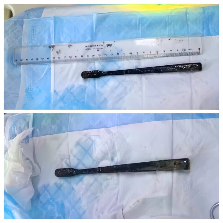 2回目の手術は10月31日に実施された。患者には全身麻酔が施され、医師は内視鏡をゆっくりと挿入した。すると、胃液に侵されて黒ずみ、形が歪んだ歯ブラシが画面にくっきりと現れた。歯ブラシは長期にわたり胃の中にあったために胃壁の組織と強く癒着していた。さらに胃腔の空間が限られていて器具の操作も困難だったため、すべての操作が綱渡りのような慎重さを要した。医師は狭い胃腔の中で内視鏡を巧みに操って歯ブラシをしっかりと捉え、角度をゆっくりと調整しながら、少しずつ胃壁から分離させ、完全な形で取り出した。男性はその後、無事退院することができた。