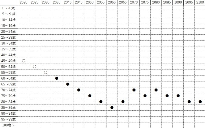 グラフをご覧いただきたい。これは、2020年から2100年までの間、日本の人口の最大勢力が5歳刻みのどの年齢層になるかの推移を表したものだ。〇は男性、⚫は女性。それによると、今年2025年は50~54歳の男性が最も多い。2030年以降は予測値になるが、人口は比較的正確な将来予測が可能なので、よほどの予期せぬ事態(大戦争、疫病、大災害など)が発生しない限り、このグラフ通りになると考えられる。