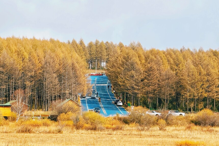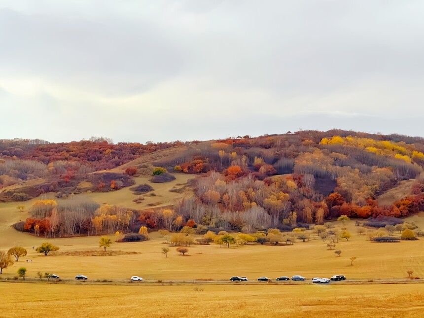 秋が訪れ、河北省囲場満族蒙古(モンゴル)族自治県は、1年で最も詩的な季節を迎えている。山々を覆う木々は様々な色に染まり、シラカバは黄金色の衣をまとい、そよ風が吹くと、葉がまるで金箔のようにひらひらと舞い落ち、あたりに柔らかなじゅうたんを敷き詰めている。木々の間から差し込む秋の日差しは、躍動的な光と影を作り出す。遠くの丘陵を眺めると、クヌギやカエデがまるで燃え盛る炎のように真っ赤に染まり、濃緑色をしたアブラマツと見事なコントラストを形成し、この時期ならではの美しい秋景色を作り上げている。