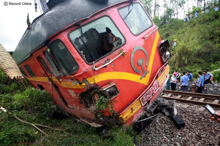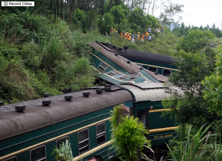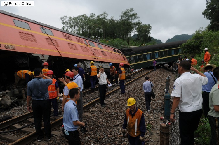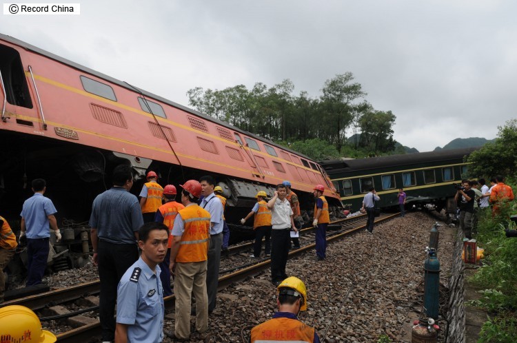 2009年8月2日、荊楚網は広西チワン族自治区南寧鉄路局宣伝部の陳鳴部長のインタビューを掲載した。同部長によると、先月29日の脱線事故は自然災害が原因だったという。写真は事故現場。