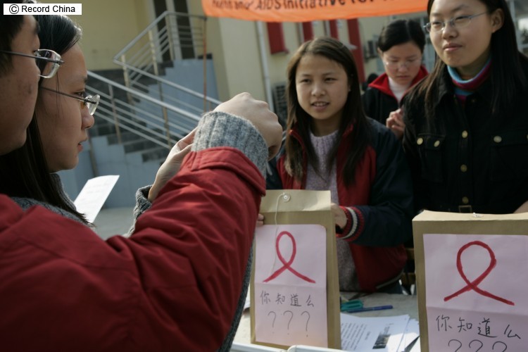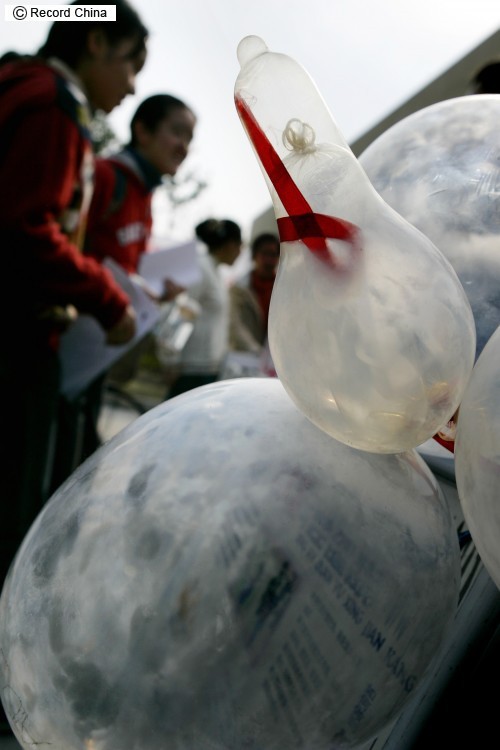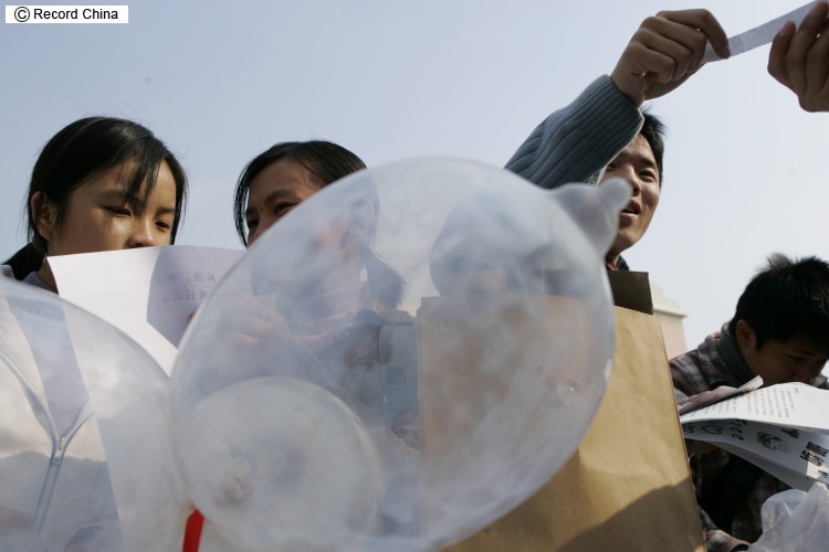 4日、仏紙はHIV感染リスクが高いとされる中国の出稼ぎ農民のエイズに対する知識が深まり、偏見が薄れてきたと報じた。写真は04年、上海交通大学で行われたエイズ予防運動。コンドーム1000個が配られた。