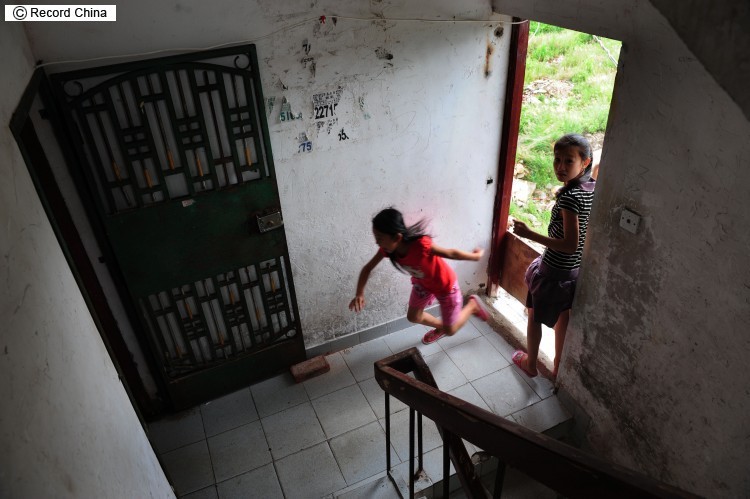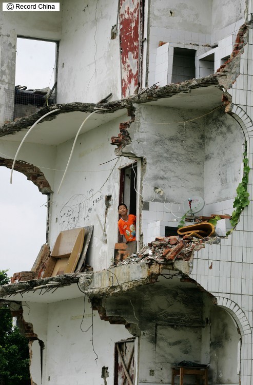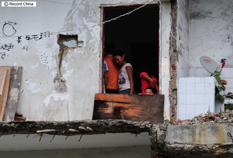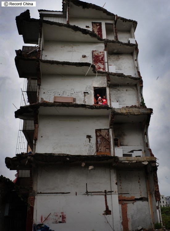 5日、広東省珠海市にある5階建てのビルは縦半分が取り壊されて跡形もなく、残った建物の半分に家主の家族と借主が住んでいる。部屋のドアを開けるとなんとそこは空中だ。