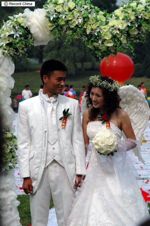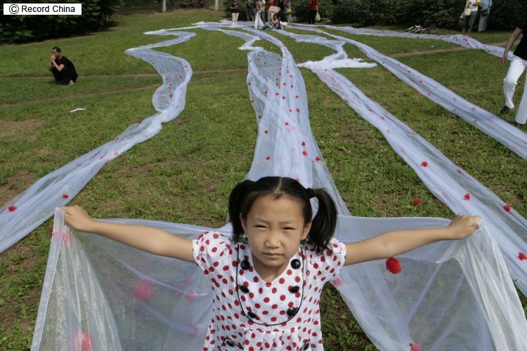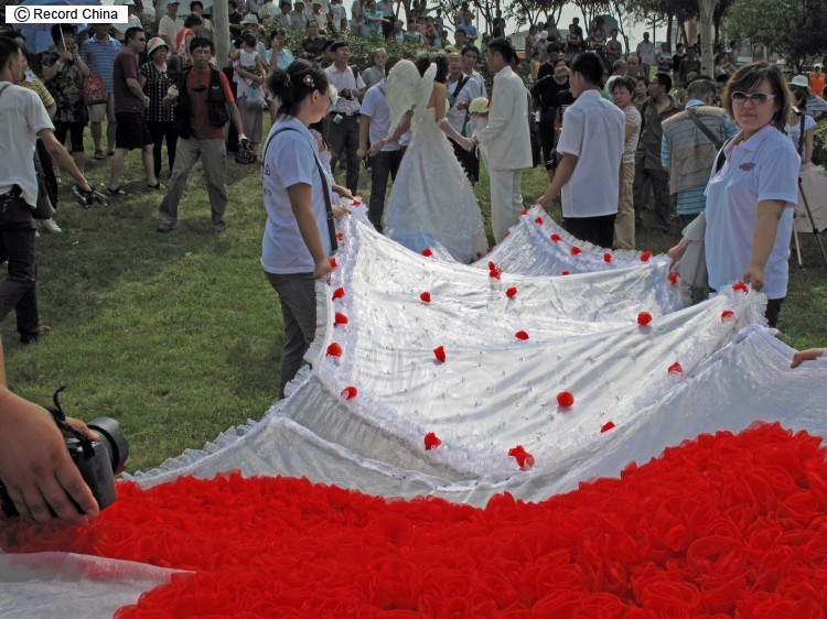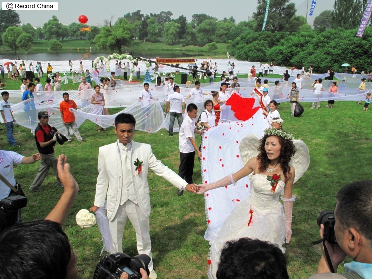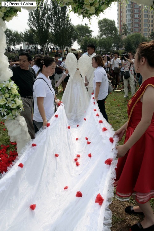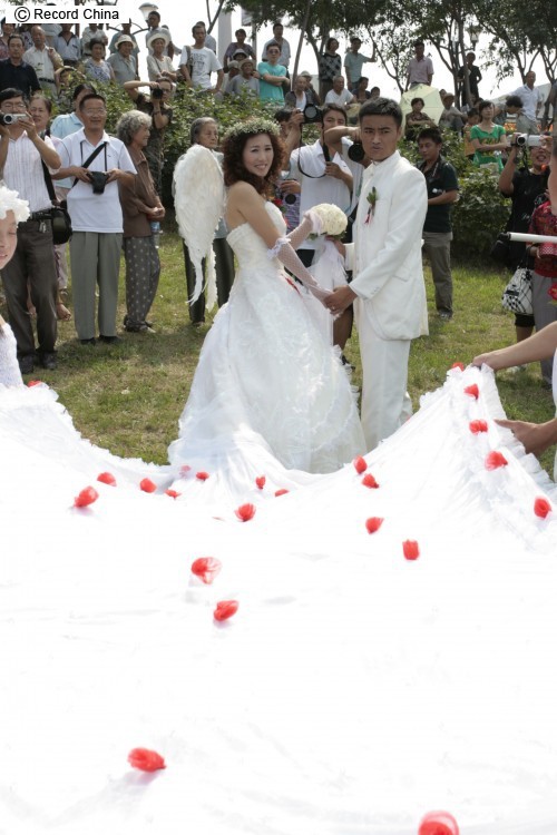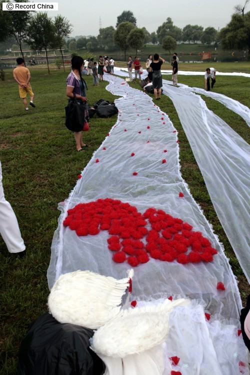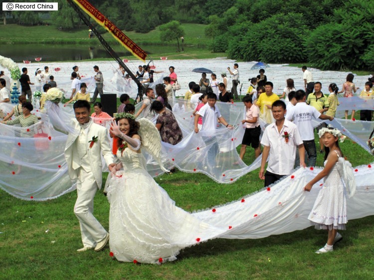 6日、吉林省で行われたアウトドア・ウェディング。このロマンティックな結婚式で新郎は、長さ2200mの自作ウェディングベールを新婦に捧げたという。ベールは世界最長としてギネスに申請する予定。